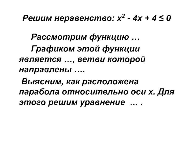 Слайд 19Решим неравенство: х2 - 4х + 4 ≤ 0