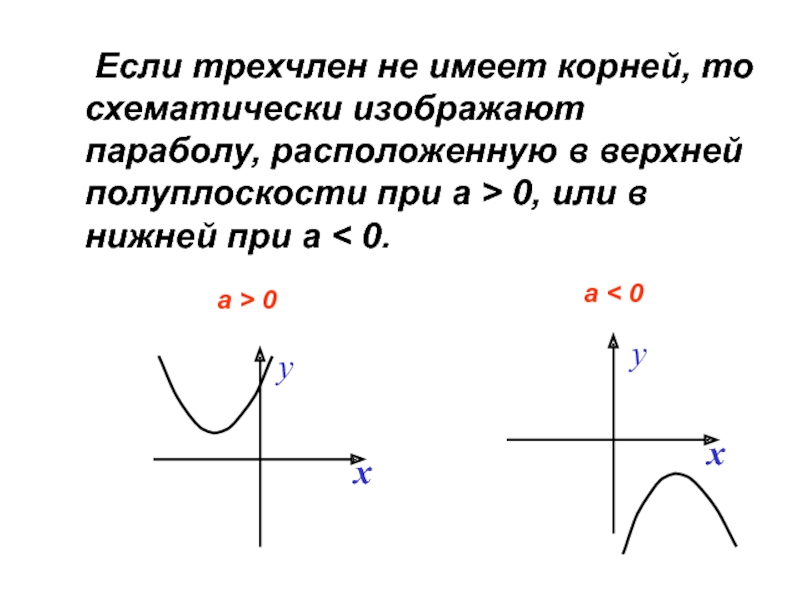 Слайд 26 Если трехчлен не имеет корней, то схематически изображают параболу, расположенную в