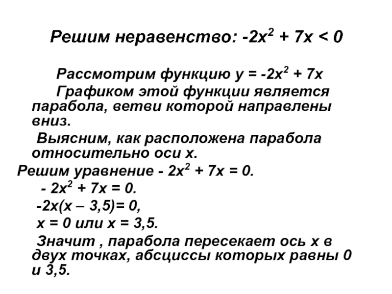 Слайд 15Решим неравенство: -2х2 + 7х < 0