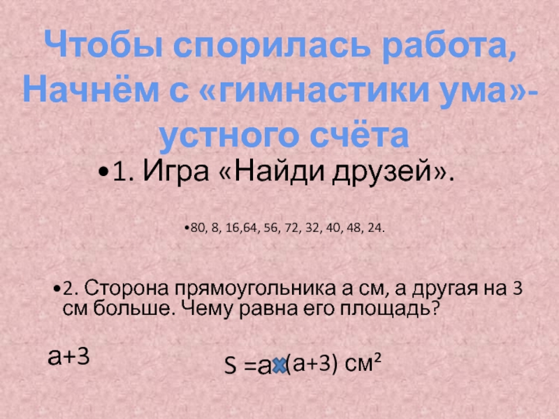 2. Сторона прямоугольника а см, а другая на 3 см больше. Чему равна его площадь?