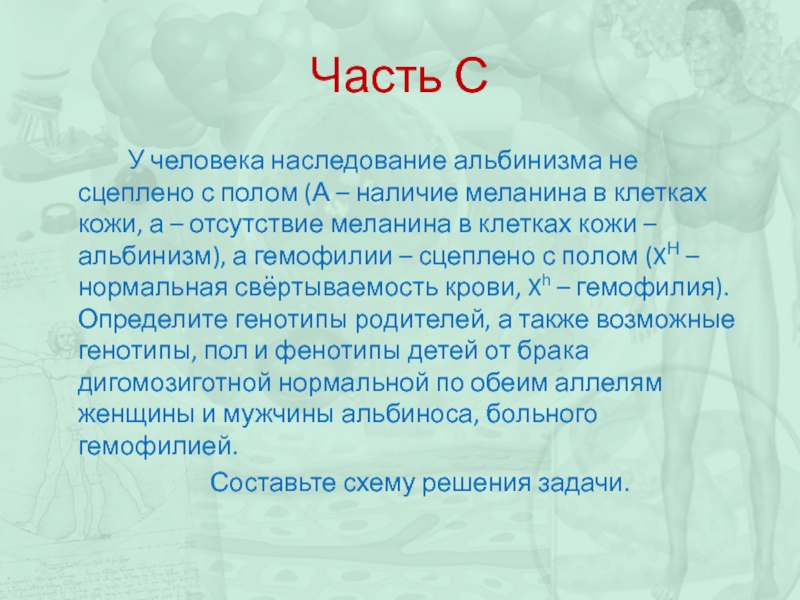 наличие меланина в клетках кожи, а – отсутствие меланина в клетках кожи – альбинизм), а гемофилии – сцеплено с полом (XН – нормальная свёртываемость крови, Xh – гемофилия). Определите генотипы родителей, а также возможные генотипы, пол и фенотипы детей от брака дигомозиготной нормальной по обеим аллелям женщины и мужчины альбиноса, больного гемофилией.