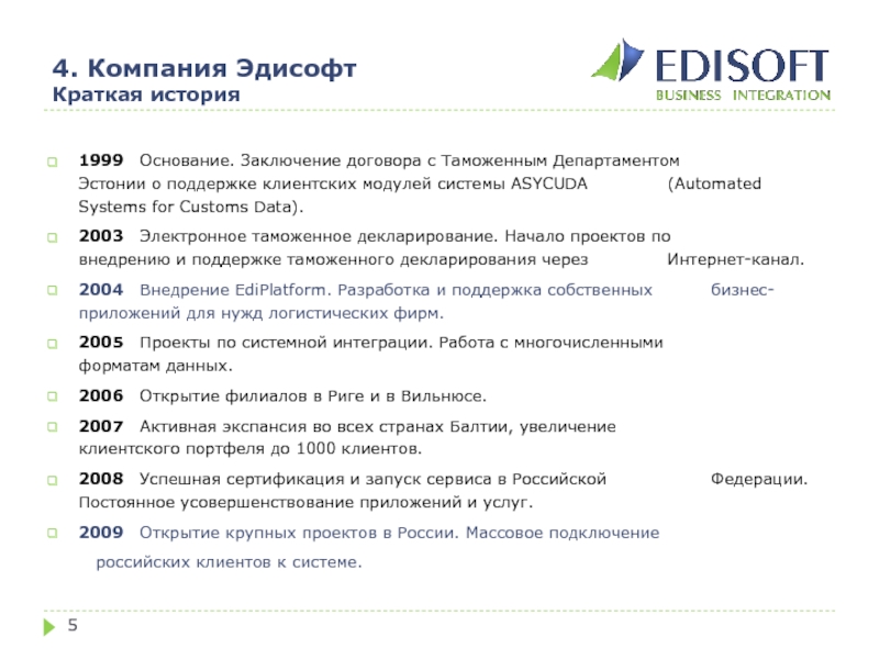 2004 Внедрение EdiPlatform. Разработка и поддержка собственных бизнес-приложений для нужд логистических фирм.