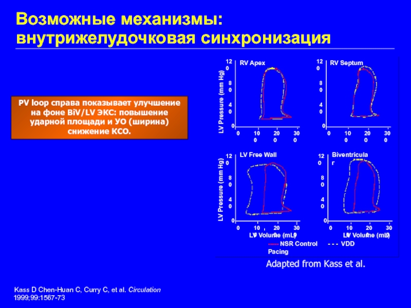 PV loop справа показывает улучшение на фоне BiV/LV ЭКС: повышение ударной площади и УО (ширина) снижение КСО.
