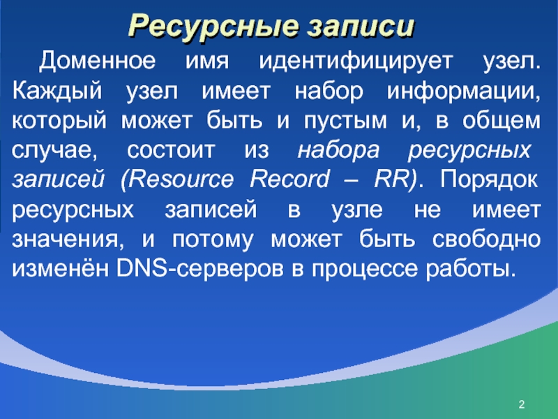 может быть и пустым и, в общем случае, состоит из набора ресурсных записей (Resource Record – RR). Порядок ресурсных записей в узле не имеет значения, и потому может быть свободно изменён DNS-серверов в процессе работы.