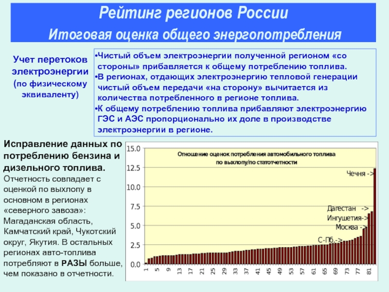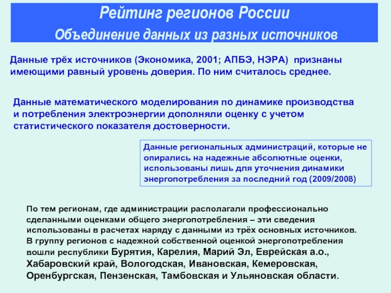 По тем регионам, где администрации располагали профессионально сделанными оценками общего энергопотребления – эти сведения использованы в расчетах наряду с данными из трёх основных источников. В группу регионов с надежной собственной оценкой энергопотребления вошли республики Бурятия, Карелия, Марий Эл, Еврейская а.о., Хабаровский край, Вологодская, Ивановская, Кемеровская, Оренбургская, Пензенская, Тамбовская и Ульяновская области.