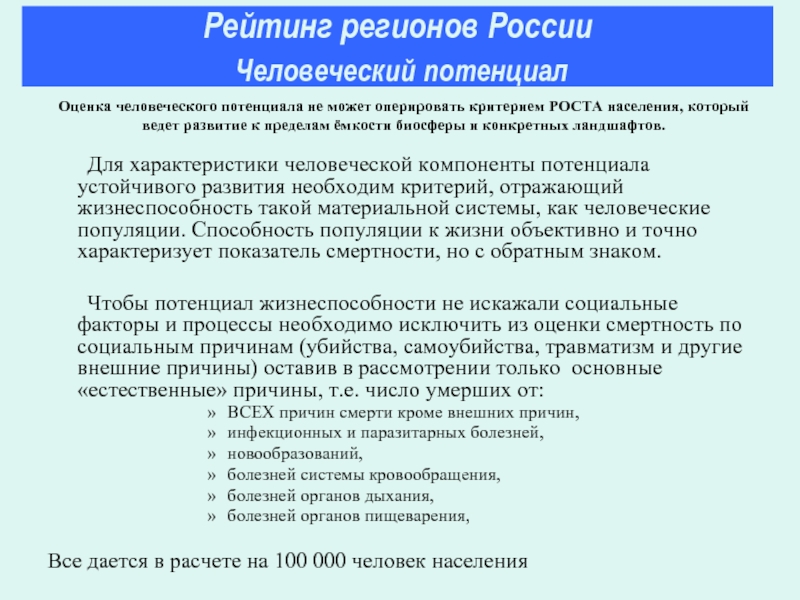 Оценка человеческого потенциала не может оперировать критерием РОСТА населения, который ведет развитие к пределам ёмкости биосферы и конкретных ландшафтов.