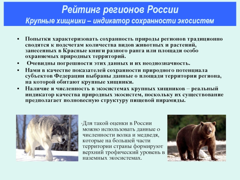 Для такой оценки в России можно использовать данные о численности волка и медведя, которые на большей части территории страны формируют верхний трофический уровень в наземных экосистемах.