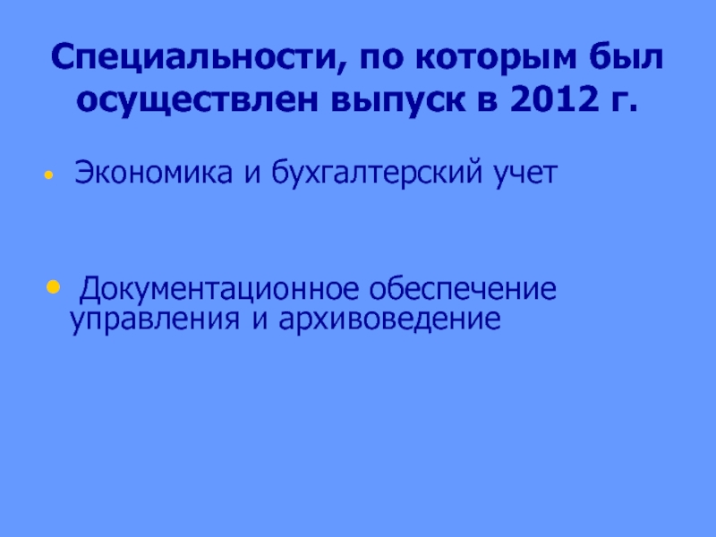Слайд 2Специальности, по которым был осуществлен выпуск в 2012 г.
