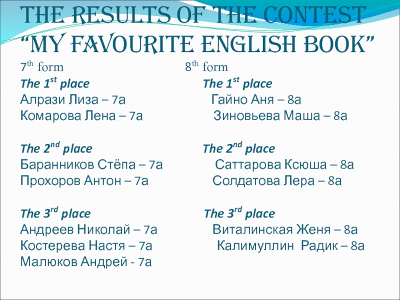 8th form The 1st place The 1st place Алрази Лиза – 7а Гайно Аня – 8а Комарова Лена – 7а Зиновьева Маша – 8а The 2nd place The 2nd place Баранников Стёпа – 7а Саттарова Ксюша – 8а Прохоров Антон – 7а Солдатова Лера – 8а The 3rd place The 3rd place Андреев Николай – 7а Виталинская Женя – 8а Костерева Настя – 7а Калимуллин Радик – 8а Малюков Андрей - 7а