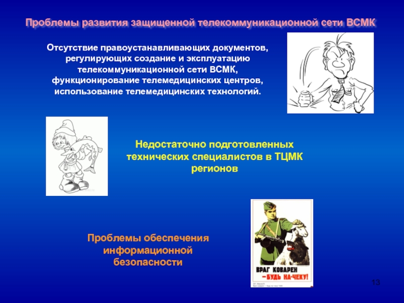 Отсутствие правоустанавливающих документов, регулирующих создание и эксплуатацию телекоммуникационной сети ВСМК, функционирование телемедицинских центров, использование телемедицинских технологий.