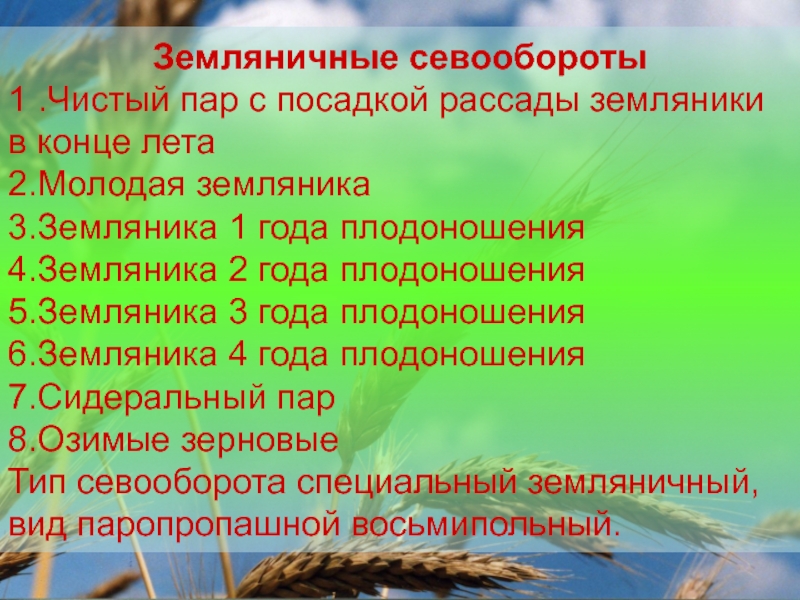 Тип севооборота специальный земляничный, вид паропропашной восьмипольный.