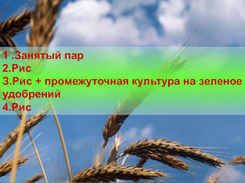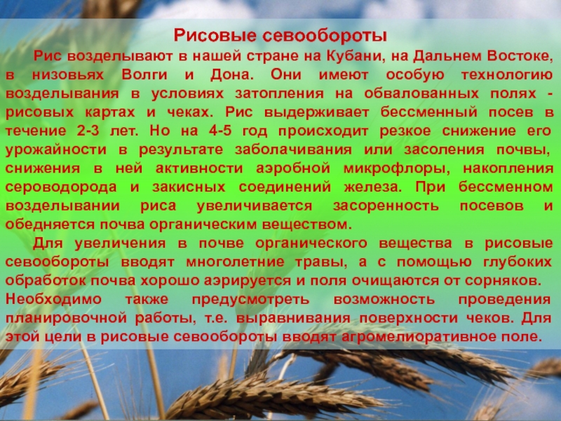 в низовьях Волги и Дона. Они имеют особую технологию возделывания в условиях затопления на обвалованных полях - рисовых картах и чеках. Рис выдерживает бессменный посев в течение 2-3 лет. Но на 4-5 год происходит резкое снижение его урожайности в результате заболачивания или засоления почвы, снижения в ней активности аэробной микрофлоры, накопления сероводорода и закисных соединений железа. При бессменном возделывании риса увеличивается засоренность посевов и обедняется почва органическим веществом.
