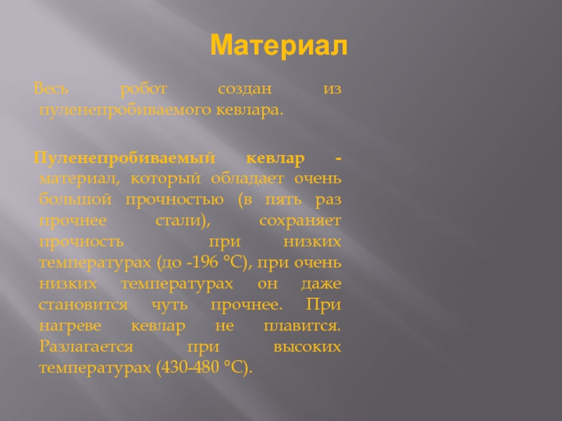 очень большой прочностью (в пять раз прочнее стали), сохраняет прочность при низких температурах (до -196 °C), при очень низких температурах он даже становится чуть прочнее. При нагреве кевлар не плавится. Разлагается при высоких температурах (430-480 °C).