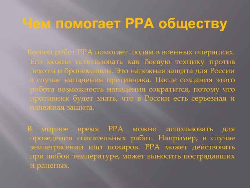 Его можно использовать как боевую технику против пехоты и бронемашин. Это надежная защита для России в случае нападения противника. После создания этого робота возможность нападения сократится, потому что противник будет знать, что в России есть серьезная и надежная защита.