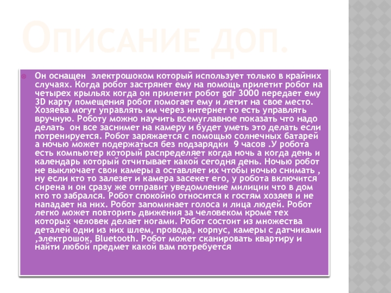 робот застрянет ему на помощь прилетит робот на четырех крыльях когда он прилетит робот gdr 3000 передает ему 3D карту помещения робот помогает ему и летит на свое место. Хозяева могут управлять им через интернет то есть управлять вручную. Роботу можно научить всемуглавное показать что надо делать он все заснимет на камеру и будет уметь это делать если потренируется. Робот заряжается с помощью солнечных батарей а ночью может подержаться без подзарядки 9 часов .У робота есть компьютер который распределяет когда ночь а когда день и календарь который отчитывает какой сегодня день. Ночью робот не выключает свои камеры а оставляет их чтобы ночью снимать , ну если кто то залезет и камера засекет его, у робота включится сирена и он сразу же отправит уведомление милиции что в дом кто то забрался. Робот спокойно относится к гостям хозяев и не нападает на них. Робот запоминает голоса и лица людей. Робот легко может повторить движения за человеком кроме тех которых человек делает ногами. Робот состоит из множества деталей одни из них шлем, провода, корпус, камеры с датчиками ,электрошок, Bluetooth. Робот может сканировать квартиру и найти любой предмет какой вам потребуется