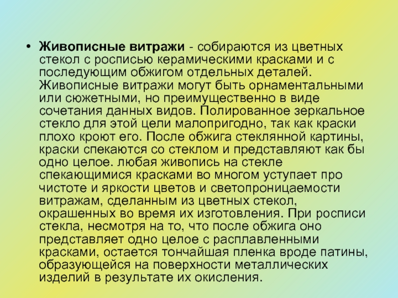 и с последующим обжигом отдельных деталей. Живописные витражи могут быть орнаментальными или сюжетными, но преимущественно в виде сочетания данных видов. Полированное зеркальное стекло для этой цели малопригодно, так как краски плохо кроют его. После обжига стеклянной картины, краски спекаются со стеклом и представляют как бы одно целое. любая живопись на стекле спекающимися красками во многом уступает про чистоте и яркости цветов и светопроницаемости витражам, сделанным из цветных стекол, окрашенных во время их изготовления. При росписи стекла, несмотря на то, что после обжига оно представляет одно целое с расплавленными красками, остается тончайшая пленка вроде патины, образующейся на поверхности металлических изделий в результате их окисления.