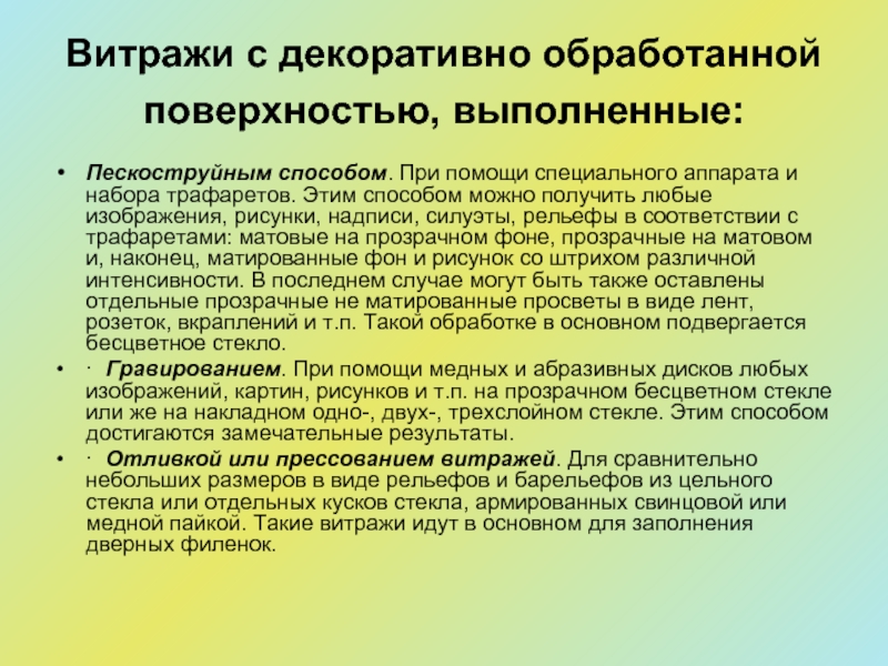 Слайд 12Витражи с декоративно обработанной поверхностью, выполненные: