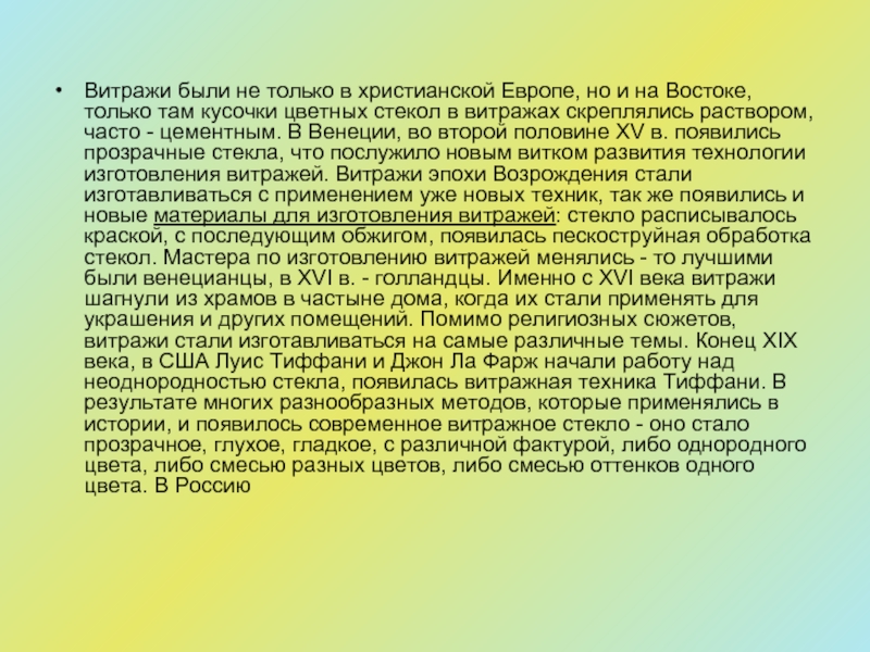 только там кусочки цветных стекол в витражах скреплялись раствором, часто - цементным. В Венеции, во второй половине XV в. появились прозрачные стекла, что послужило новым витком развития технологии изготовления витражей. Витражи эпохи Возрождения стали изготавливаться с применением уже новых техник, так же появились и новые материалы для изготовления витражей: стекло расписывалось краской, с последующим обжигом, появилась пескоструйная обработка стекол. Мастера по изготовлению витражей менялись - то лучшими были венецианцы, в XVI в. - голландцы. Именно с XVI века витражи шагнули из храмов в частыне дома, когда их стали применять для украшения и других помещений. Помимо религиозных сюжетов, витражи стали изготавливаться на самые различные темы. Конец XIX века, в США Луис Тиффани и Джон Ла Фарж начали работу над неоднородностью стекла, появилась витражная техника Тиффани. В результате многих разнообразных методов, которые применялись в истории, и появилось современное витражное стекло - оно стало прозрачное, глухое, гладкое, с различной фактурой, либо однородного цвета, либо смесью разных цветов, либо смесью оттенков одного цвета. В Россию