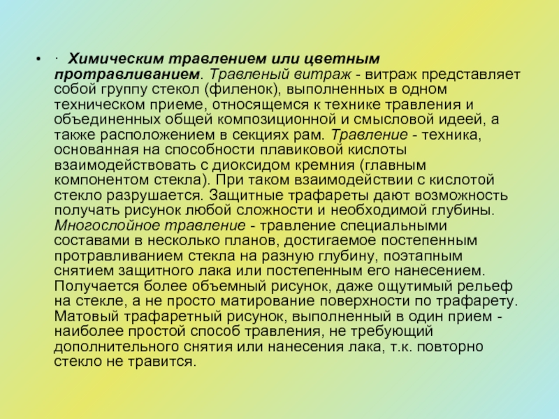 Слайд 13· Химическим травлением или цветным протравливанием. Травленый витраж - витраж представляет