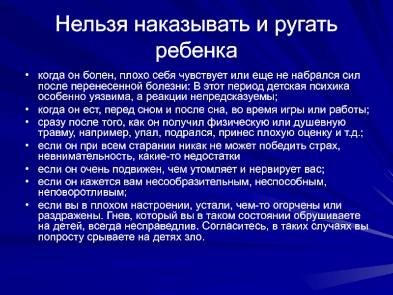если вы в плохом настроении, устали, чем-то огорчены или раздражены. Гнев, который вы в таком состоянии обрушиваете на детей, всегда несправедлив. Согласитесь, в таких случаях вы попросту срываете на детях зло.