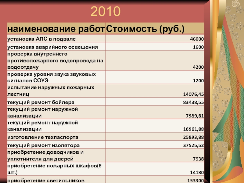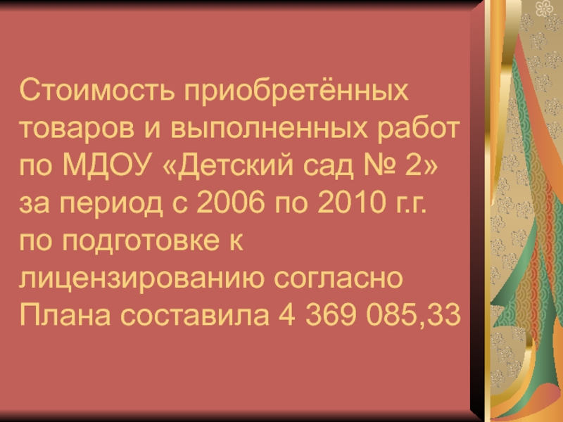 Слайд 5Стоимость приобретённых товаров и выполненных работ по МДОУ «Детский сад №