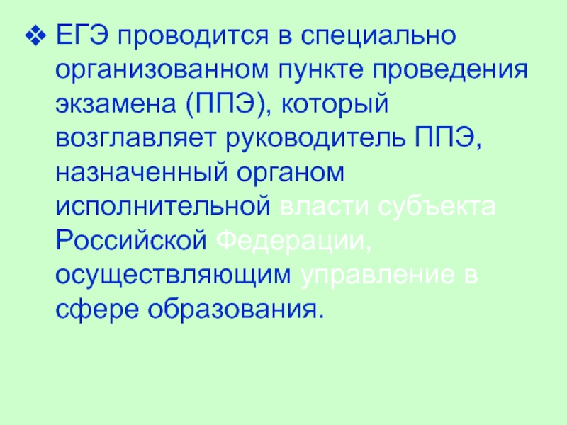 Слайд 2ЕГЭ проводится в специально организованном пункте проведения экзамена (ППЭ), который возглавляет