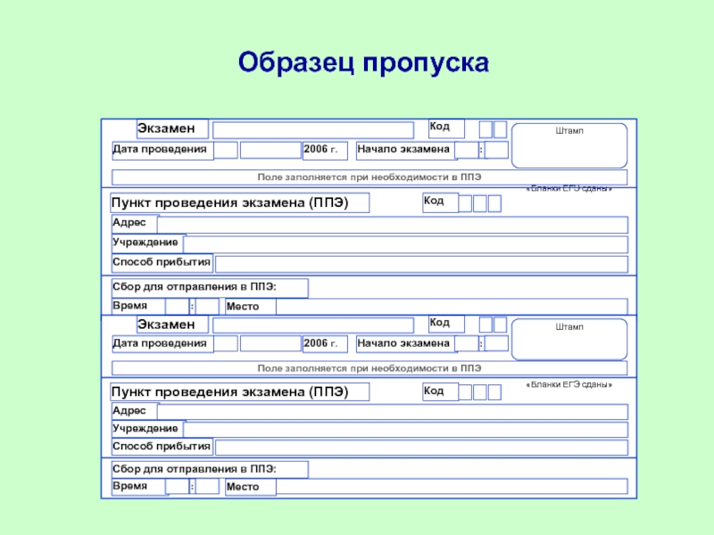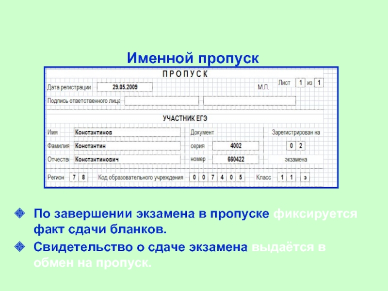 По завершении экзамена в пропуске фиксируется факт сдачи бланков.