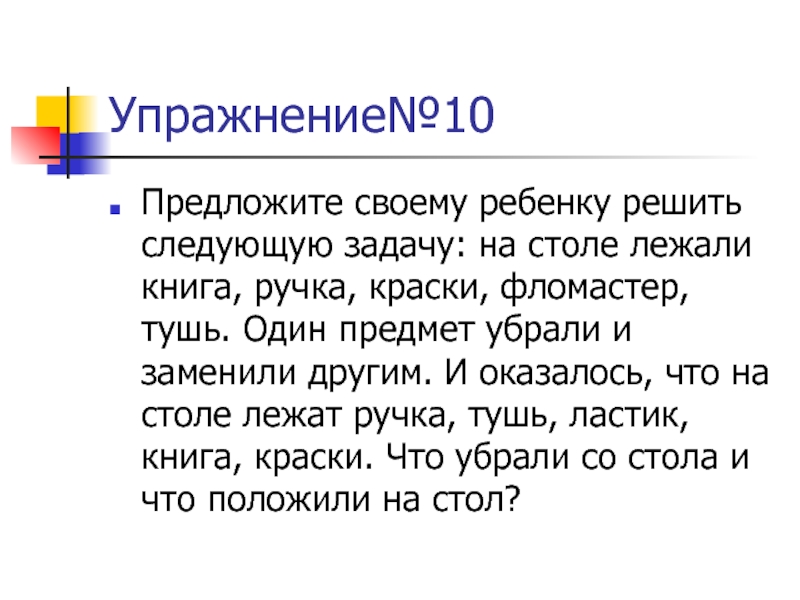 Предложите своему ребенку решить следующую задачу: на столе лежали книга, ручка,