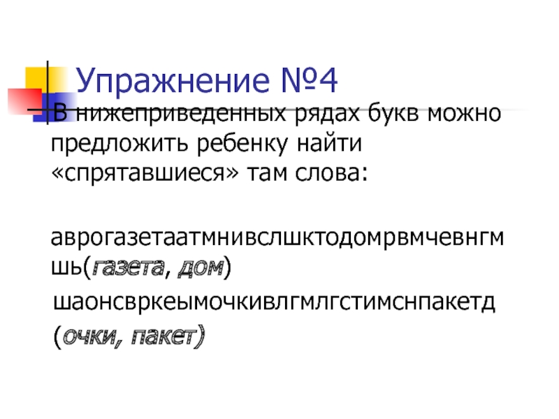 В нижеприведенных рядах букв можно предложить ребенку найти
