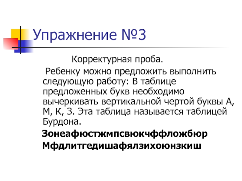 Ребенку можно предложить выполнить следующую работу: В таблице предложенных букв необходимо вычеркивать вертикальной чертой буквы А, М, К, З. Эта таблица называется таблицей Бурдона.