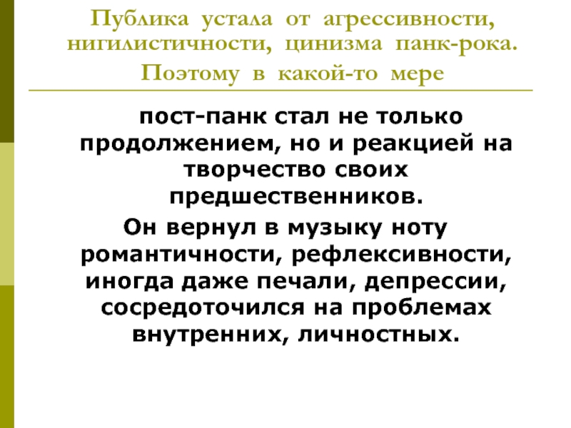 Слайд 28Публика устала от агрессивности, нигилистичности, цинизма панк-рока.