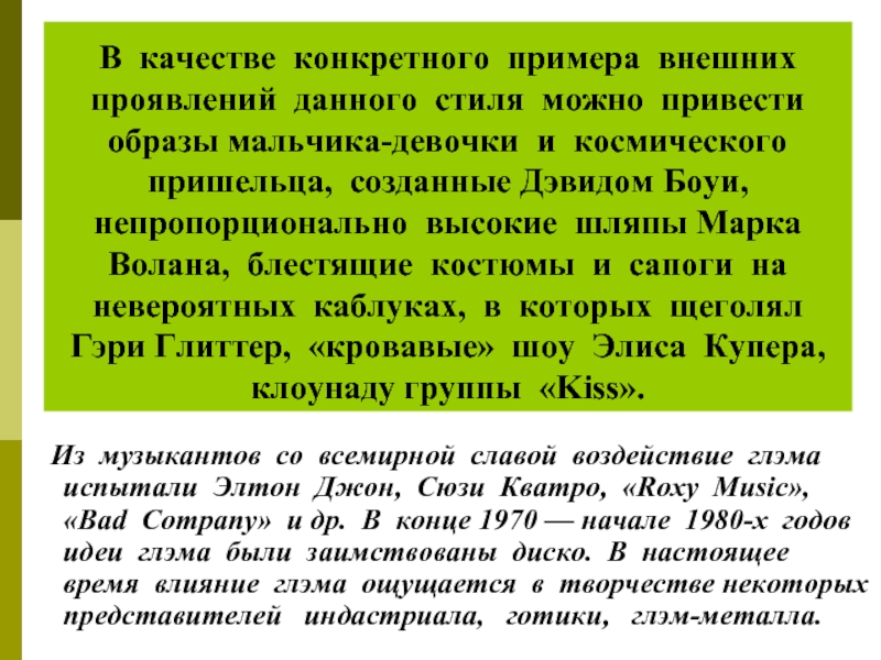 мальчика-девочки и космического пришельца, созданные Дэвидом Боуи, непропорционально высокие шляпы Марка Волана, блестящие костюмы и сапоги на невероятных каблуках, в которых щеголял Гэри Глиттер, «кровавые» шоу Элиса Купера, клоунаду группы «Kiss».