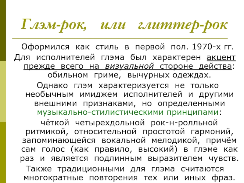 Однако глэм характеризуется не только необычным имиджем исполнителей и другими внешними признаками, но определенными музыкально-стилистическими принципами: