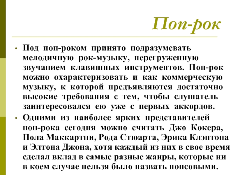 Под поп-роком принято подразумевать мелодичную рок-музыку, перегруженную звучанием клавишных инструментов. Поп-рок