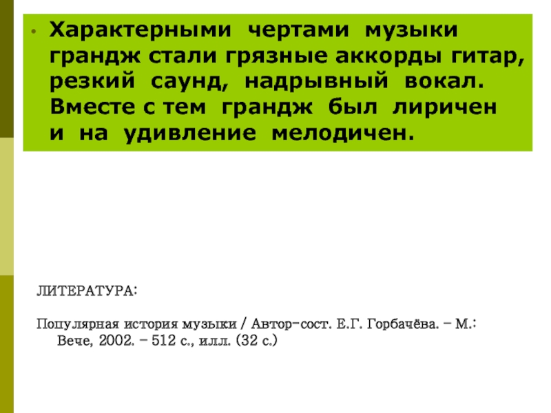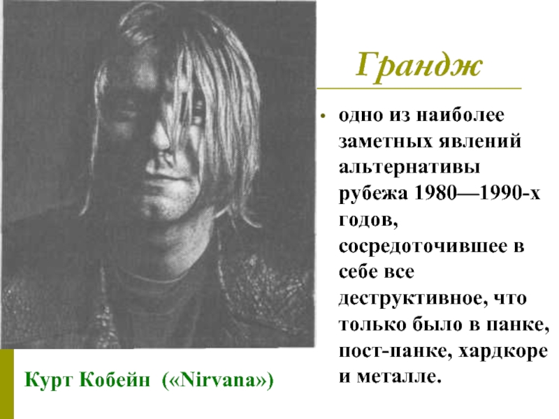 Слайд 45Характерными чертами музыки грандж стали грязные аккорды гитар, резкий саунд, надрывный