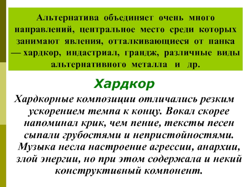 Слайд 39Альтернатива объединяет очень много направлений, центральное место среди которых занимают явления,