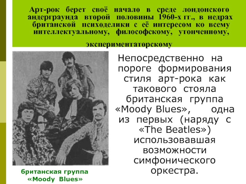 Непосредственно на пороге формирования стиля арт-рока как такового стояла британская группа «Moody Blues», одна из первых (наряду с «The Beatles») использовавшая возможности симфонического оркестра.