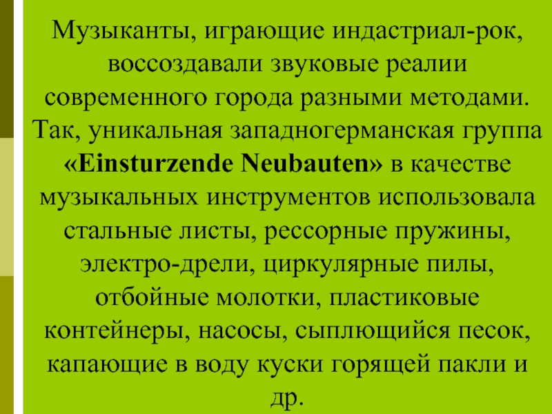 Слайд 41Музыканты, играющие индастриал-рок, воссоздавали звуковые реалии современного города разными методами. Так,