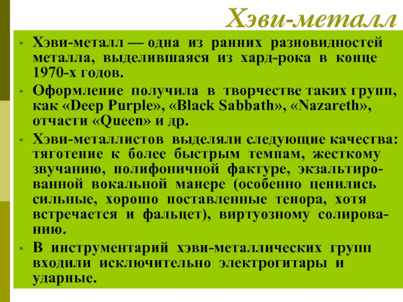 Хэви-металл — одна из ранних разновидностей металла, выделившаяся из хард-рока в