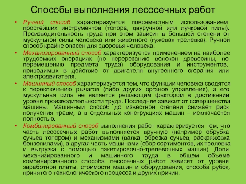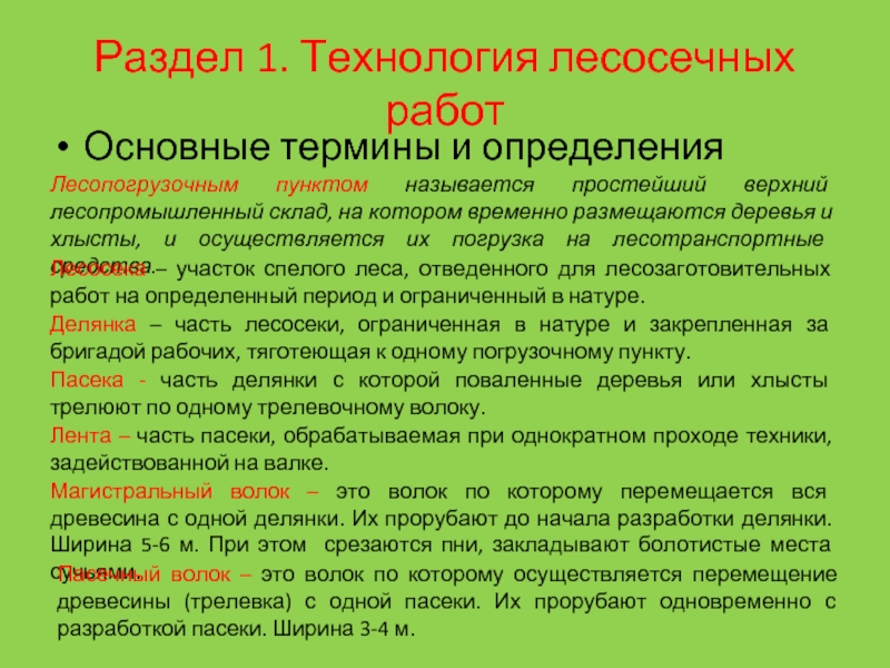 Лесосека – участок спелого леса, отведенного для лесозаготовительных работ на определенный период и ограниченный в натуре.