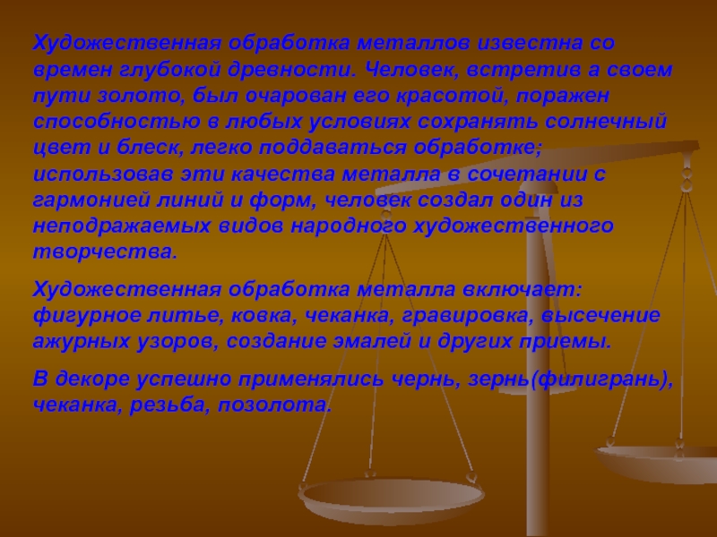 Слайд 2Художественная обработка металлов известна со времен глубокой древности. Человек, встретив а