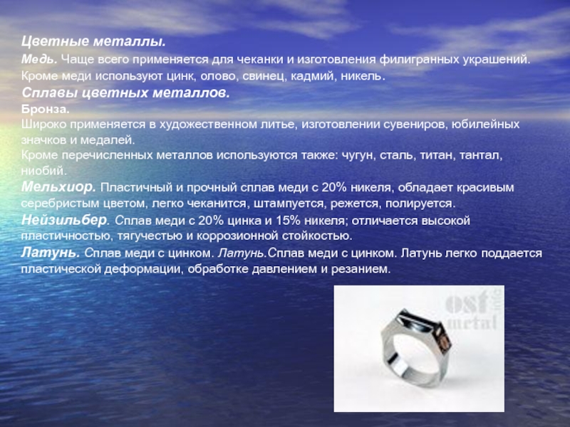 Медь. Чаще всего применяется для чеканки и изготовления филигранных украшений.