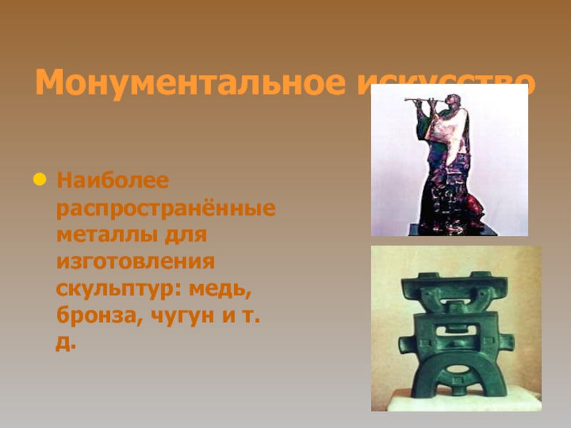 Наиболее распространённые металлы для изготовления скульптур: медь, бронза, чугун и