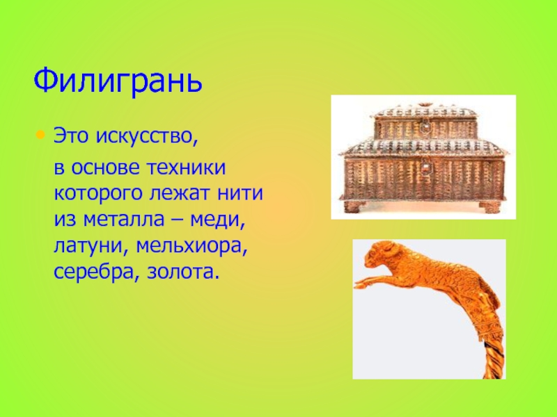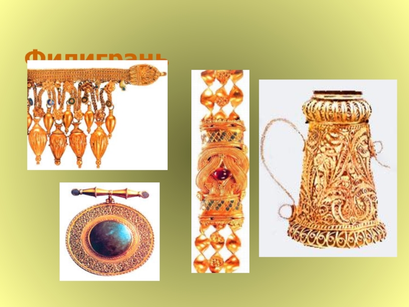 своем пути золото, был очарован его красотой, поражен способностью в любых условиях сохранять солнечный цвет и блеск, легко поддаваться обработке; использовав эти качества металла в сочетании с гармонией линий и форм, человек создал один из неподражаемых видов народного художественного творчества.