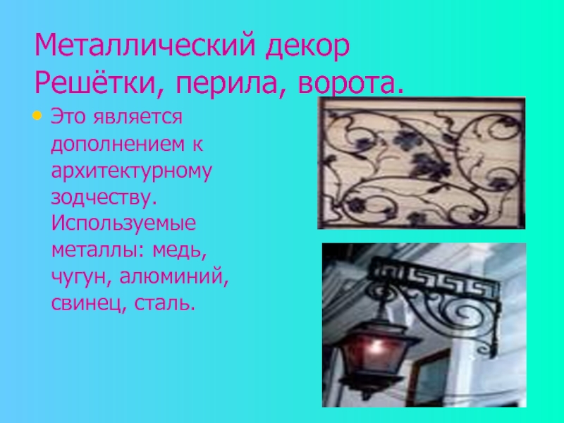 Это является дополнением к архитектурному зодчеству. Используемые металлы: