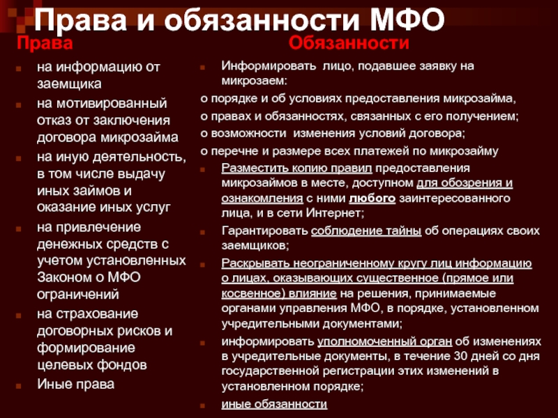 - на информацию о МФО, о лицах, влияющих на принятие ею решений, о правилах предоставления займов, об эффективной процентной ставке, о страховании рисков и др.