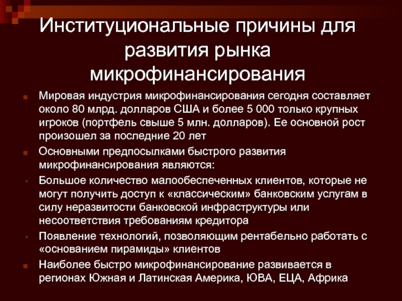 Слайд 3Институциональные причины для развития рынка микрофинансирования