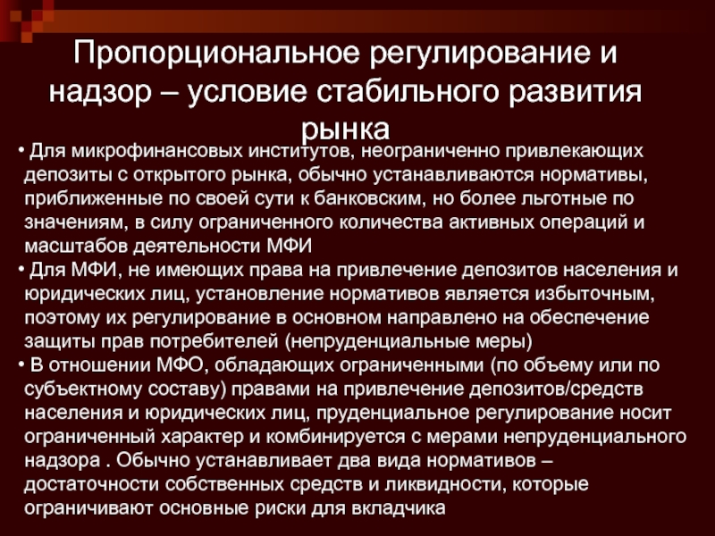 В отношении МФО, обладающих ограниченными (по объему или по субъектному составу) правами на привлечение депозитов/средств населения и юридических лиц, пруденциальное регулирование носит ограниченный характер и комбинируется с мерами непруденциального надзора . Обычно устанавливает два вида нормативов – достаточности собственных средств и ликвидности, которые ограничивают основные риски для вкладчика