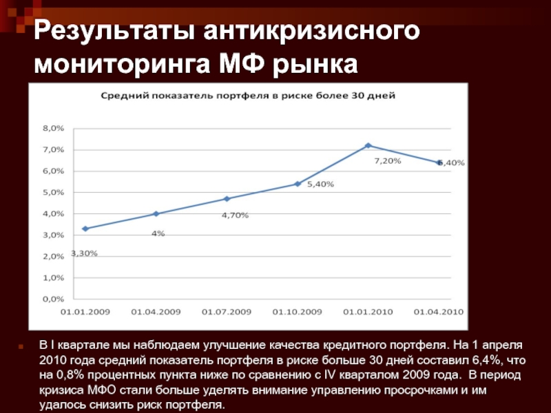 кредитного портфеля. На 1 апреля 2010 года средний показатель портфеля в риске больше 30 дней составил 6,4%, что на 0,8% процентных пункта ниже по сравнению с IV кварталом 2009 года. В период кризиса МФО стали больше уделять внимание управлению просрочками и им удалось снизить риск портфеля.