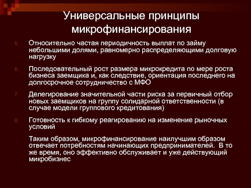 Таким образом, микрофинансирование наилучшим образом отвечает потребностям начинающих предпринимателей. В то же время, оно эффективно обслуживает и уже действующий микробизнес